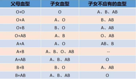 说到血型,大家已经不陌生,A型、B型、O型、AB型,对于好学一些人,已经知道什么血型的父母可以生出什么血型的孩子,常规的遗传规律在下方表格: