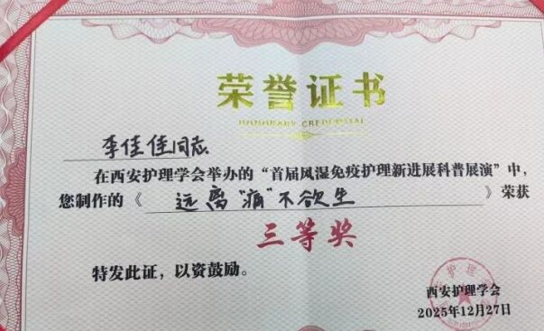 2025年12月27日,骨科一病区脊柱外科护理单元的李佳佳护士,在西安市护理学会举办的首届风湿免疫护理新进展科普展演中,凭借作品《远离“痛”不欲生》斩获三等奖。