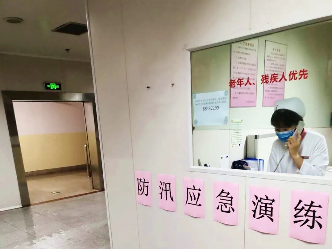 “您好,我是核医学科登记室,医技楼地下室一层雨水已进入北侧通道,有部分积水情况发生,请速来处置。”随着核医学科打出的一通汛情通报电话,防汛演练正式开始。院办公室现场“出题”:因突发强降水,雨水延地下室西门楼梯蔓延至地下室一层通道。核医学科登记室工作人员根据险情,从容拨打电话汇报、组织科内人员参与抢险。院办公室二次“出题”:积水仍得不到控制,有人员受伤。科室即刻将情况汇报给防汛救灾应急指挥中心及保卫科,“地下室一层雨水进入北侧通道,现场还有两人滑倒、摔伤,积水面积仍有扩大迹象,请求支援。”同时,核医学科通知肿瘤放疗科、放射科工作人员进行设备关闭、保障患者、员工安全。