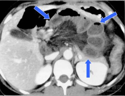 4.疝口邻近肠管:梗阻近段肠管扩张积气、积液,远段肠管相对萎陷。腹腔可伴有少量积液。